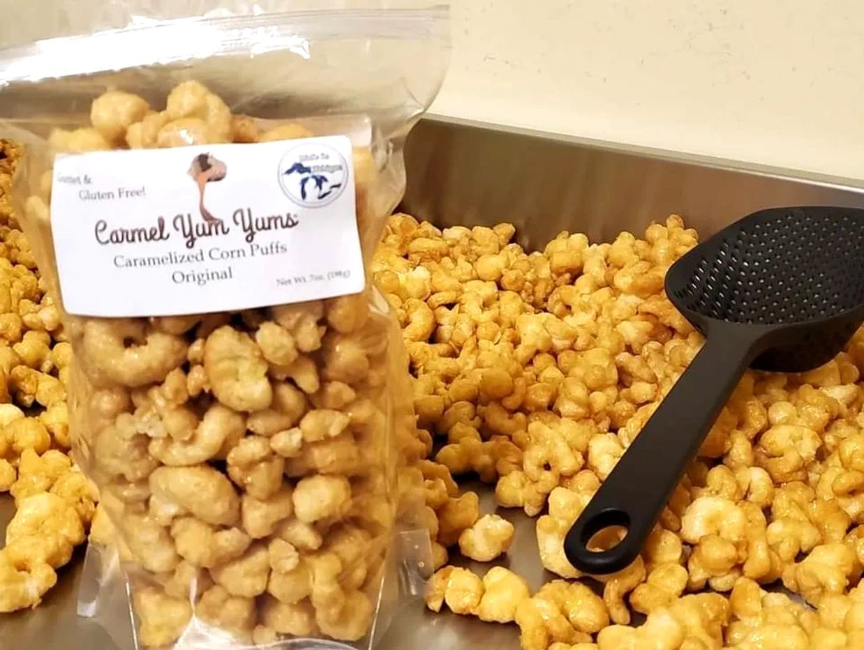 Caramel Yum Yums are small batch, made to order. caramelized corn puffs that deliver all the sweet, buttery crunch of traditional caramel corn — without the hulls or seeds! Made in a nut-free, commercial kitchen in Michigan, our oven-baked treats are a favorite for snack lovers of all ages.